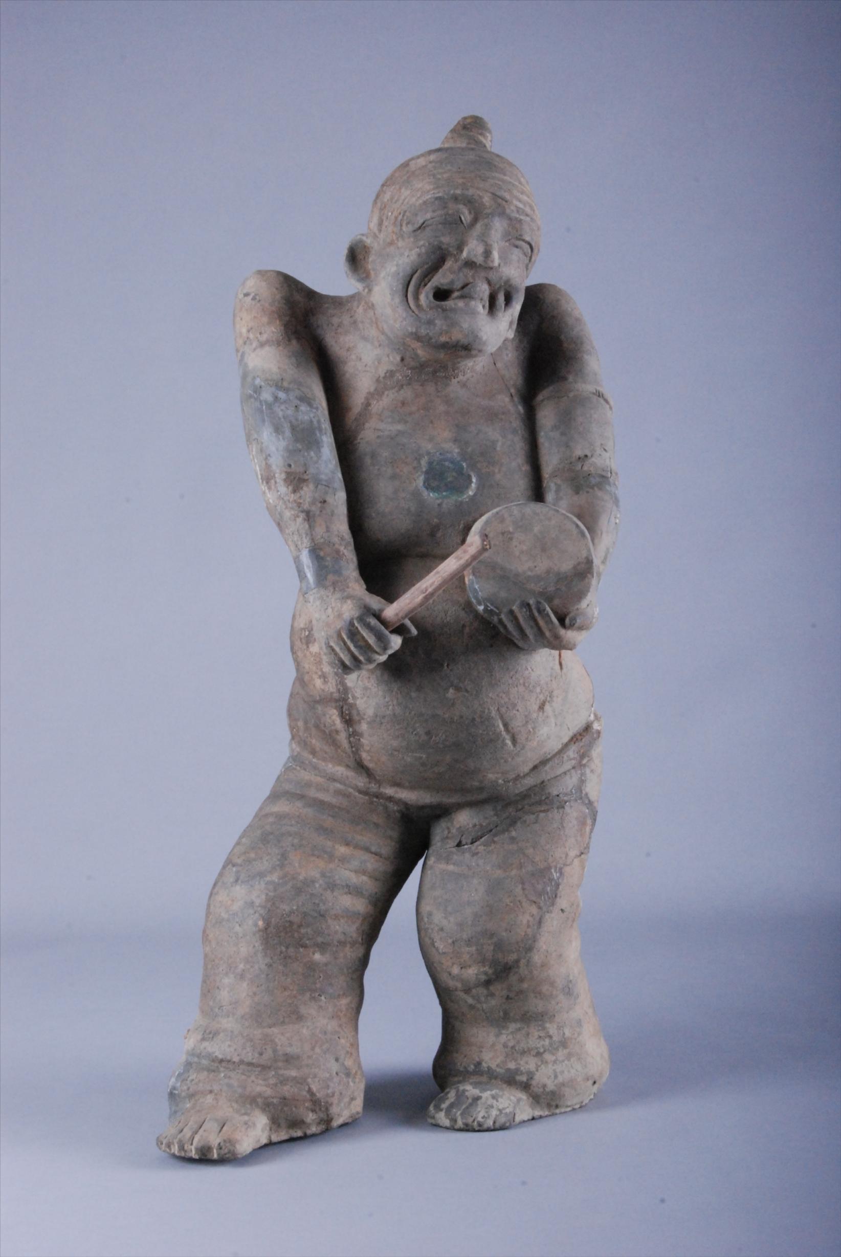 出土于四川成都郫都区的东汉陶说唱俑,是最能代表这一阶段乐舞的文物之一。这尊俑呈站立姿势,袒胸鼓腹,左臂夹鼓,右手作击鼓状,挤眉吐舌,表情滑稽夸张,极富感染力。其造型生动展现了汉代俳优表演者的职业特征 ,见证了汉代说唱艺术的繁荣和古代雕塑技艺的精湛,同时反映了古代四川人乐观幽默的地域文化特质。展览还专门为这尊俑设计了互动装置,站在屏幕前跟随音乐模拟打鼓动作,就能通过动作捕捉技术,现场体验汉代“节奏大师”的乐趣。