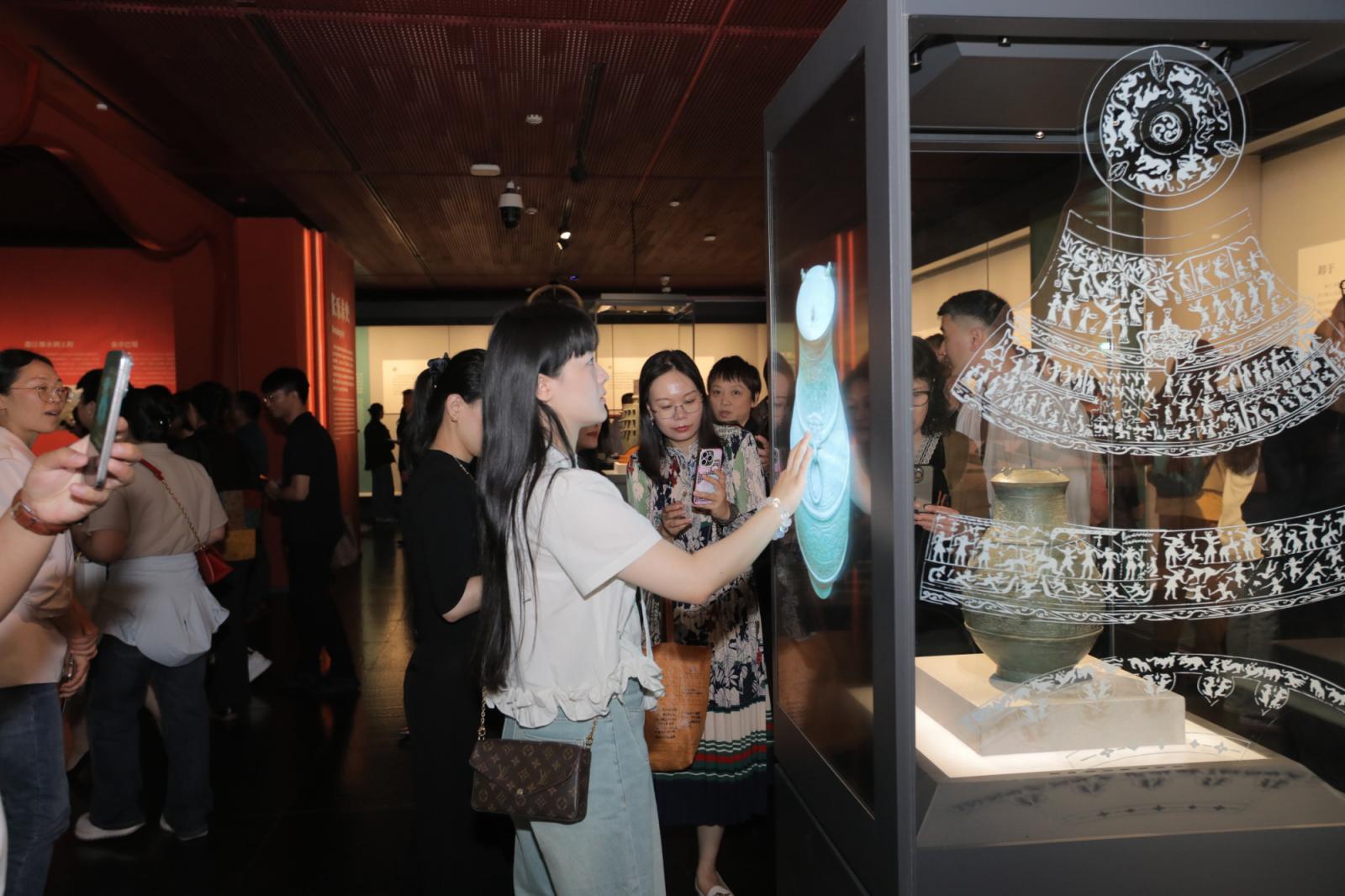 唐宋时期,中原雅乐与西域胡乐在巴蜀地区碰撞、交融,宫廷乐舞从高雅殿堂走向市井瓦肆,乐舞艺术的发展到达新的高峰。在“雅俗共声”这一篇章,“永陵二十四伎乐浮雕”以多媒体手段呈现,2位舞伎和22位乐伎的摆放位置、形态、职责不仅清晰可见,站在投影前轻触屏幕,箜篌、琵琶的旋律瞬间流淌出来,连击三下还能触发“芙蓉落英”的动画,仿佛穿越到杜甫笔下“锦城丝管日纷纷”的盛景,一览千年前“宫廷女子交响乐团”的风采。